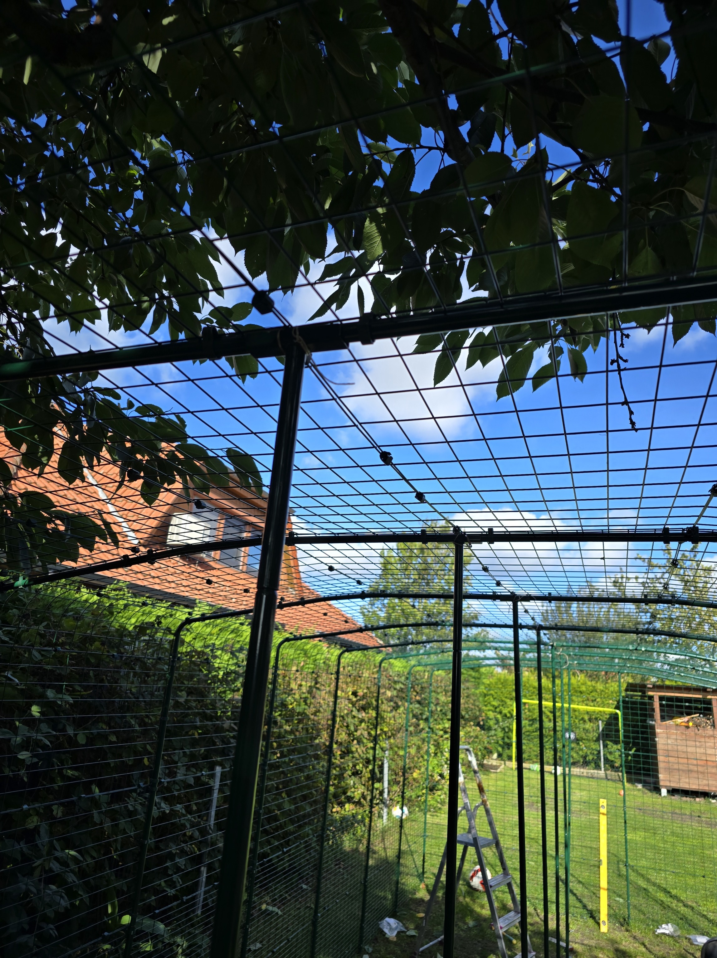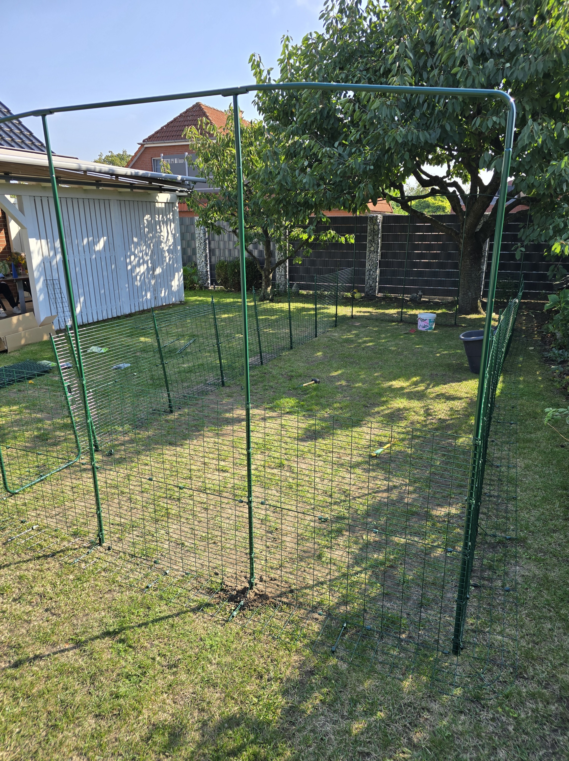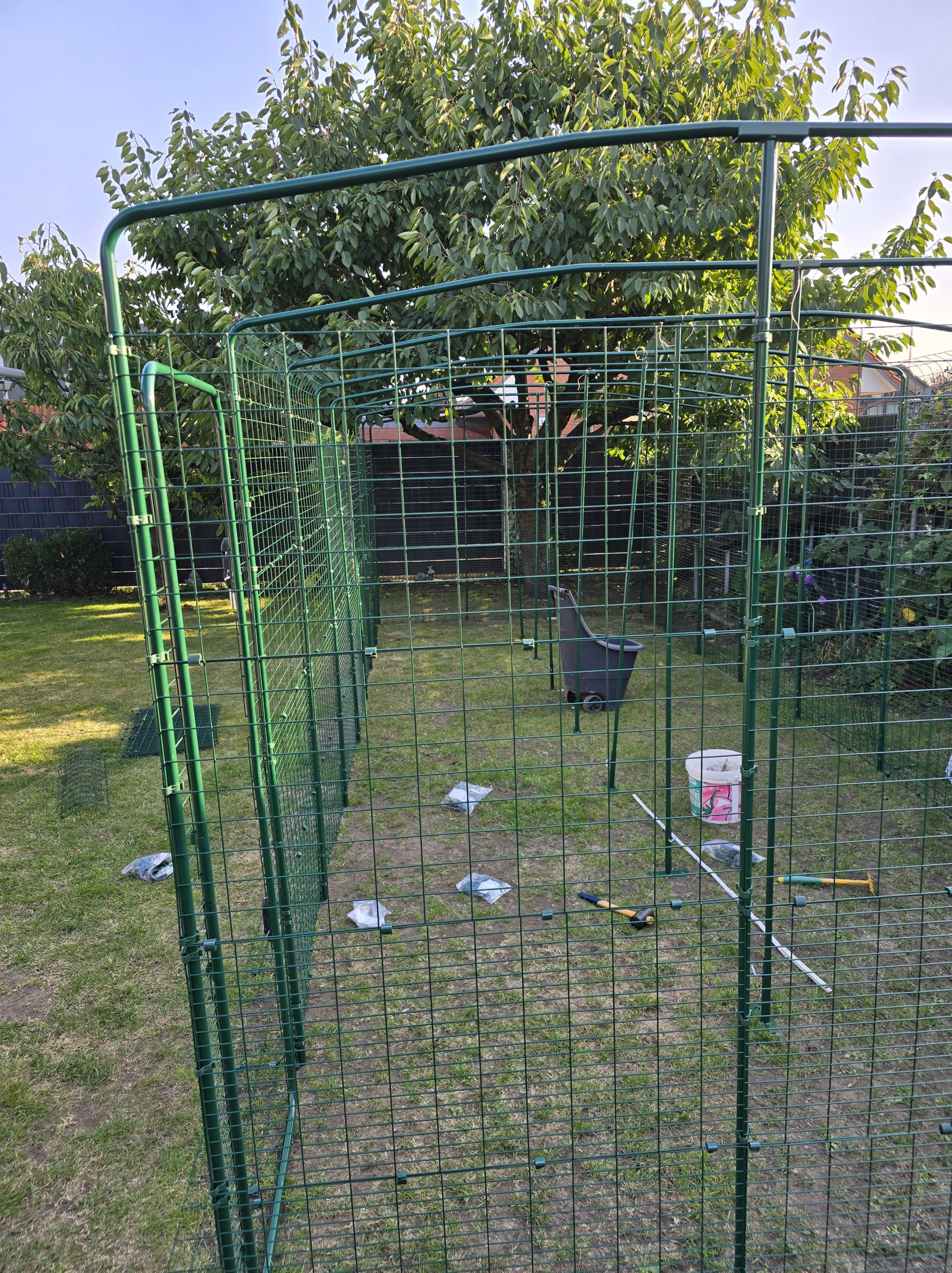Grünes Katzengehege mit Dachbogen im Garten, teilweise fertig montiert
