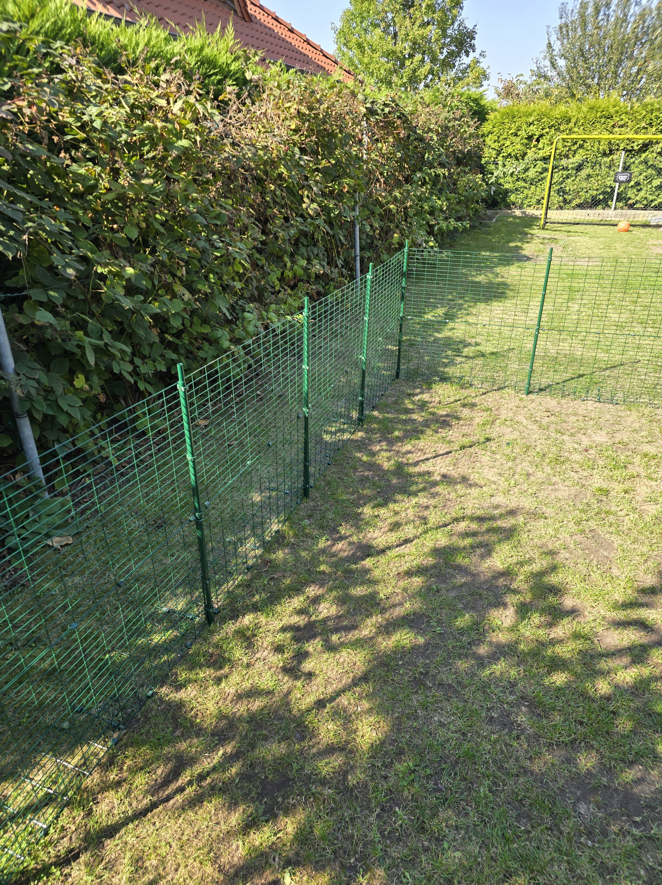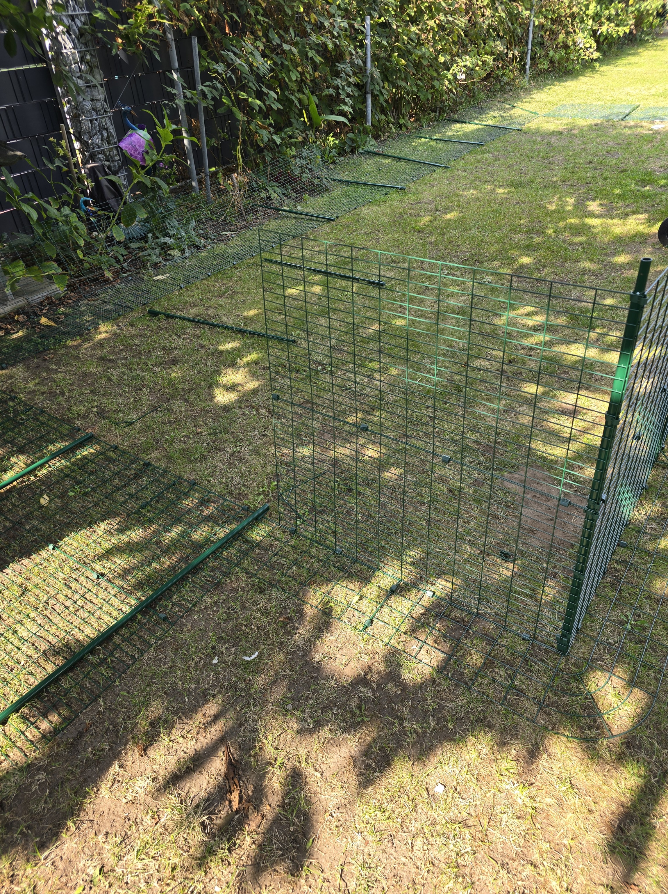 Erste Ecke eines Katzengeheges mit grünen Gitterelementen im Garten