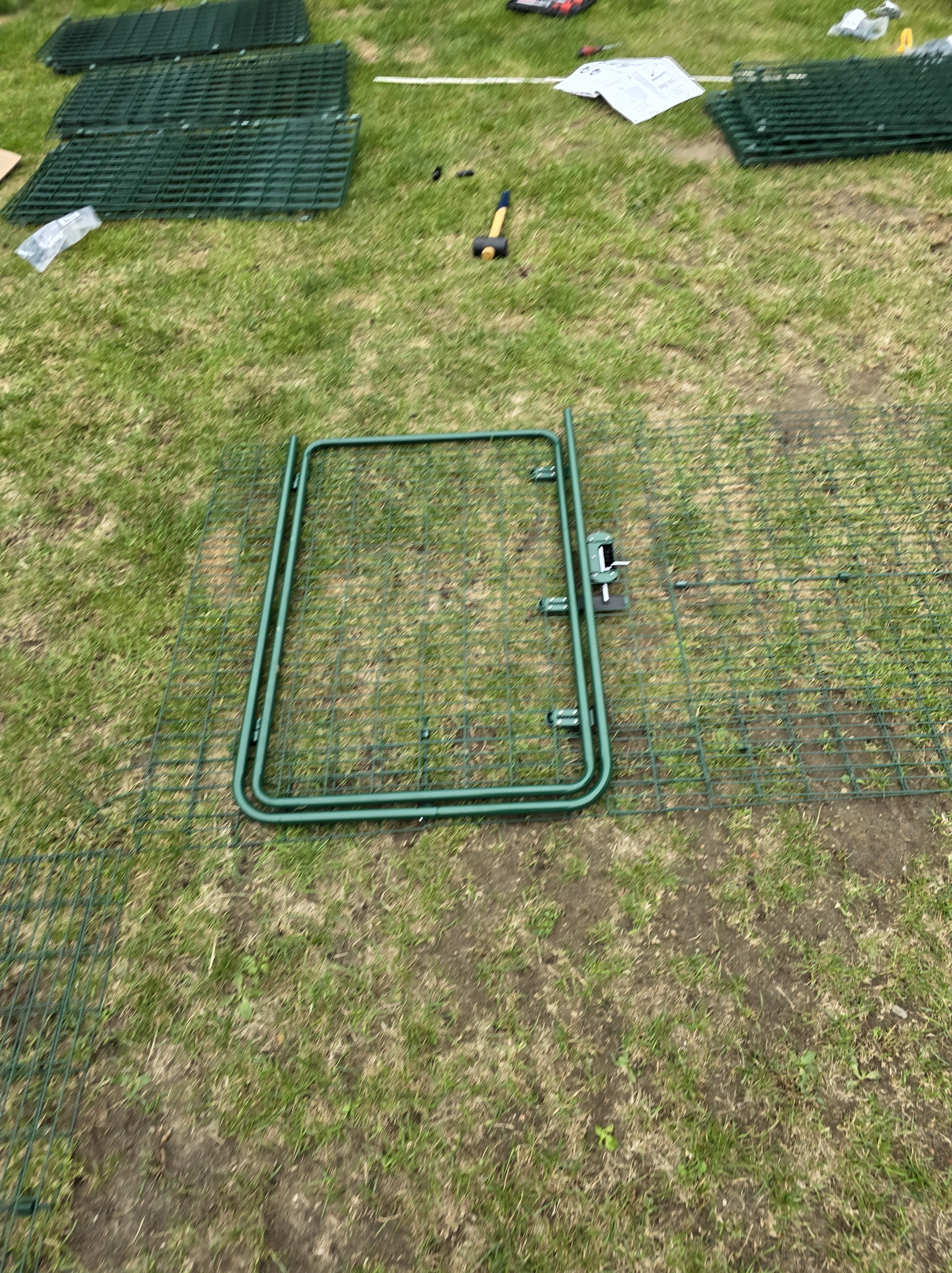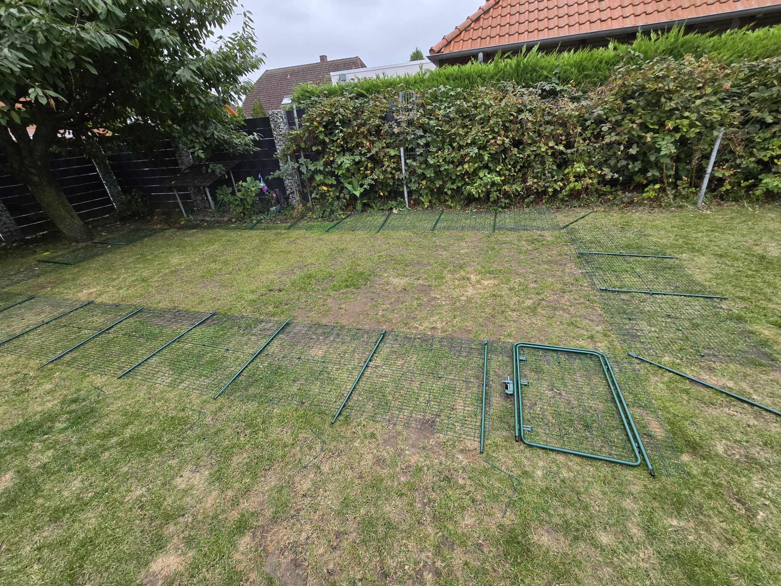 Ausgelegte Gitterelemente und Türrahmen für ein Katzengehege auf dem Rasen